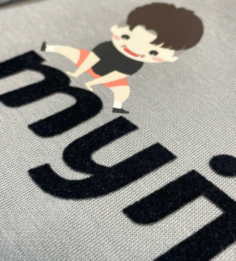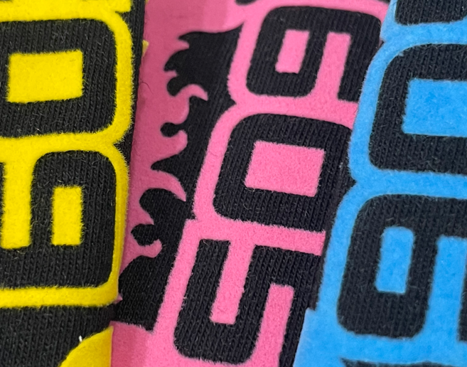 相較亮面印花,植絨呈現溫潤的霧面質感,適合極簡文字與 LOGO 設計。
